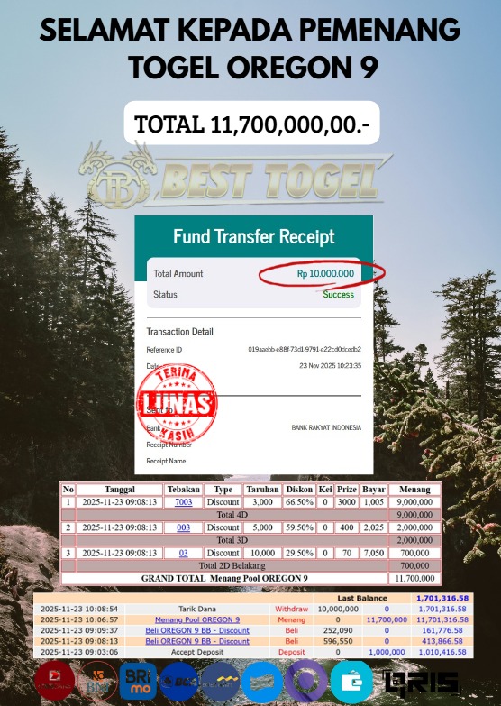 Selamat kepada User id : TIK****** Telah berhasil mendapatkan kemenangan besar pada permainan TOGEL OREGON 9 dengan total kemenangan Sebesar Rp 11.700.000 ,- Setelah mengisi formulir withdraw dengan kurung waktu hanya 5 – 10 menit pihak BESTTOGEL sudah melakukan transfer kepada pemilik Userid dan dana sudah dapat di cairkan oleh pemenang. Bukti pembayaran yang kami berikan merupakan bukti pembayaran yang SAH / VALID yang langung di dapatkan melaui tanda transfer transaksi dari Bank yang di tuju.