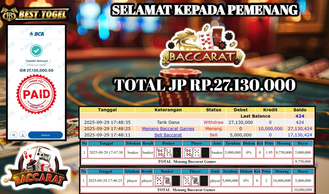 kepada User id : SEND**** Telah berhasil mendapatkan kemenangan besar pada permainan BACCARAT GAMES dengan total kemenangan Sebesar Rp. 27.130.000,- Setelah mengisi formulir withdraw dengan kurung waktu hanya 5 – 10 menit pihak BESTTOGEL sudah melakukan transfer kepada pemilik Userid dan dana sudah dapat di cairkan oleh pemenang. Bukti pembayaran yang kami berikan merupakan bukti pembayaran yang SAH / VALID yang langung di dapatkan melaui tanda transfer transaksi dari Bank yang di tuju.