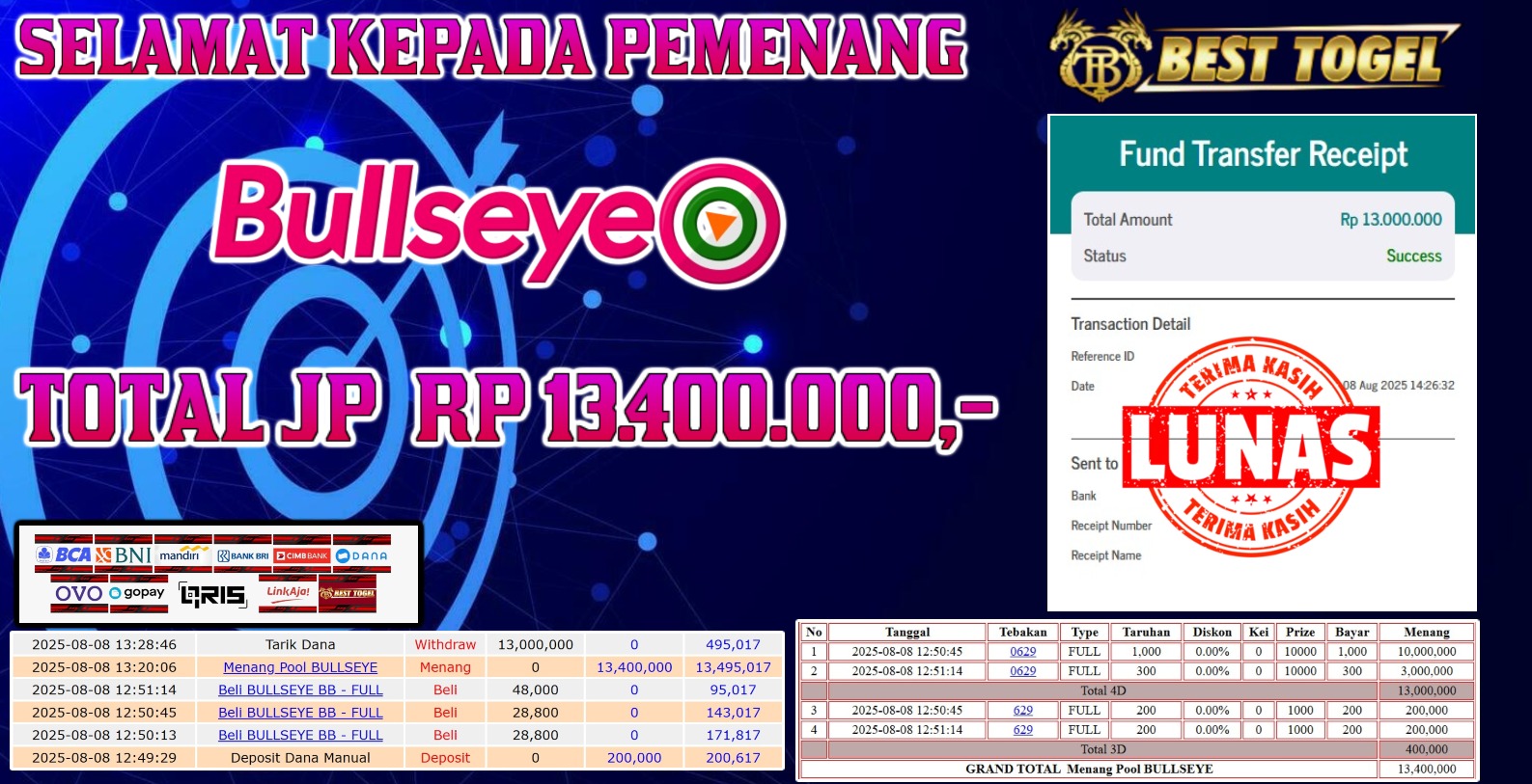kepada User id : HRJ***** Telah berhasil mendapatkan kemenangan besar pada permainan BULLSEYE dengan total kemenangan Sebesar Rp. 13.400.000,00- Setelah mengisi formulir withdraw dengan kurung waktu hanya 5 – 10 menit pihak BESTTOGEL sudah melakukan transfer kepada pemilik Userid dan dana sudah dapat di cairkan oleh pemenang. Bukti pembayaran yang kami berikan merupakan bukti pembayaran yang SAH / VALID yang langung di dapatkan melaui tanda transfer transaksi dari Bank yang di tuju.