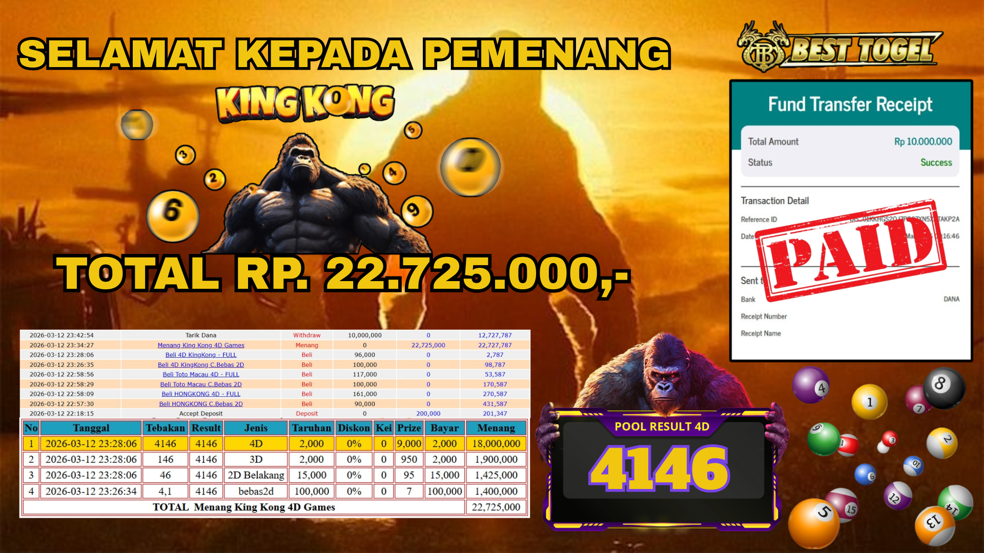 Selamat kepada User id : ZIE****** Telah berhasil mendapatkan kemenangan besar pada permainan KINGKONG 4D dengan total kemenangan Sebesar Rp. 22.725.000,– Setelah mengisi formulir withdraw dengan kurung waktu hanya 5 – 10 menit pihak BESTTOGEL sudah melakukan transfer kepada pemilik Userid dan dana sudah dapat di cairkan oleh pemenang. Bukti pembayaran yang kami berikan merupakan bukti pembayaran yang SAH / VALID yang langung di dapatkan melaui tanda transfer transaksi dari Bank yang di tuju.
