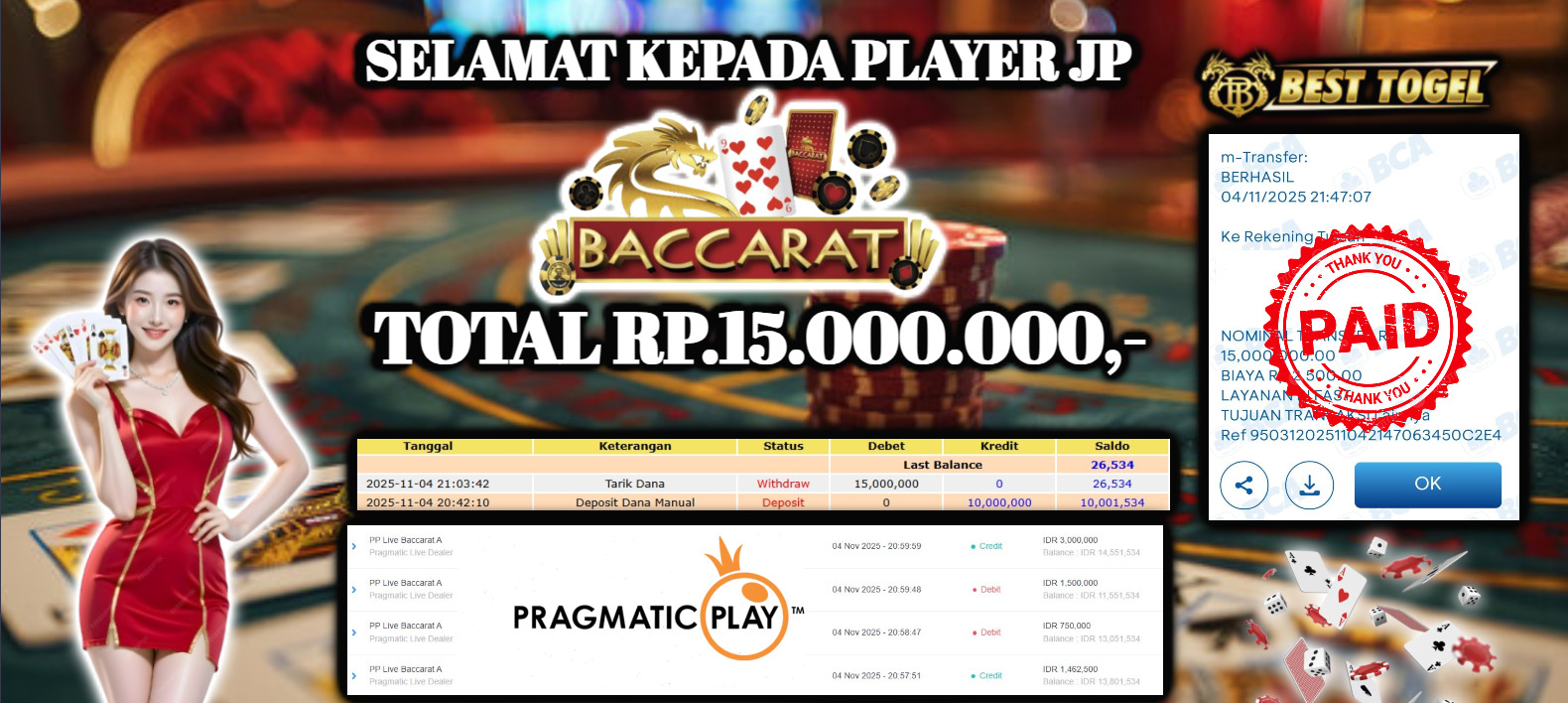 Selamat kepada User id : GRE****** Telah berhasil mendapatkan kemenangan besar pada permainan LIVE BACCARAT A dengan total kemenangan Sebesar Rp 15.000.000,- Setelah mengisi formulir withdraw dengan kurung waktu hanya 5 – 10 menit pihak BESTTOGEL sudah melakukan transfer kepada pemilik Userid dan dana sudah dapat di cairkan oleh pemenang. Bukti pembayaran yang kami berikan merupakan bukti pembayaran yang SAH / VALID yang langung di dapatkan melaui tanda transfer transaksi dari Bank yang di tuju.