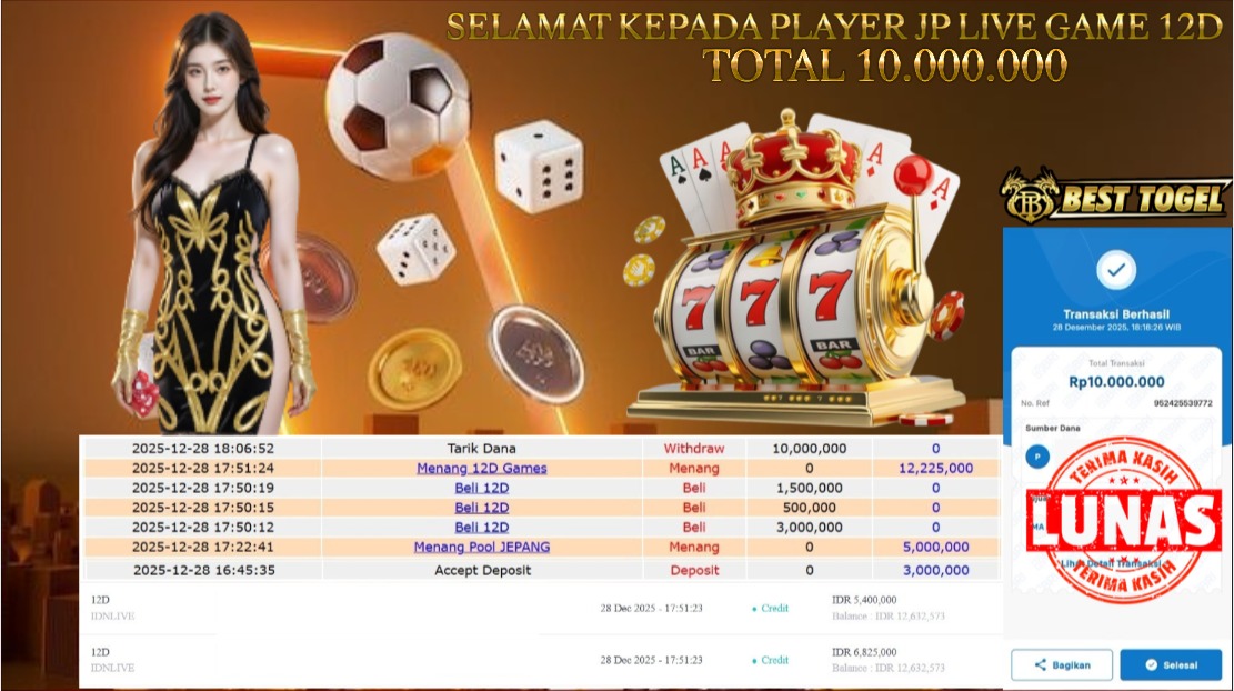 Selamat kepada User id : AYQ****** Telah berhasil mendapatkan kemenangan besar pada permainan LIVE GAME 12D dengan total kemenangan Sebesar Rp. 10.000.000,- Setelah mengisi formulir withdraw dengan kurung waktu hanya 5 – 10 menit pihak BESTTOGEL sudah melakukan transfer kepada pemilik Userid dan dana sudah dapat di cairkan oleh pemenang. Bukti pembayaran yang kami berikan merupakan bukti pembayaran yang SAH / VALID yang langung di dapatkan melaui tanda transfer transaksi dari Bank yang di tuju.