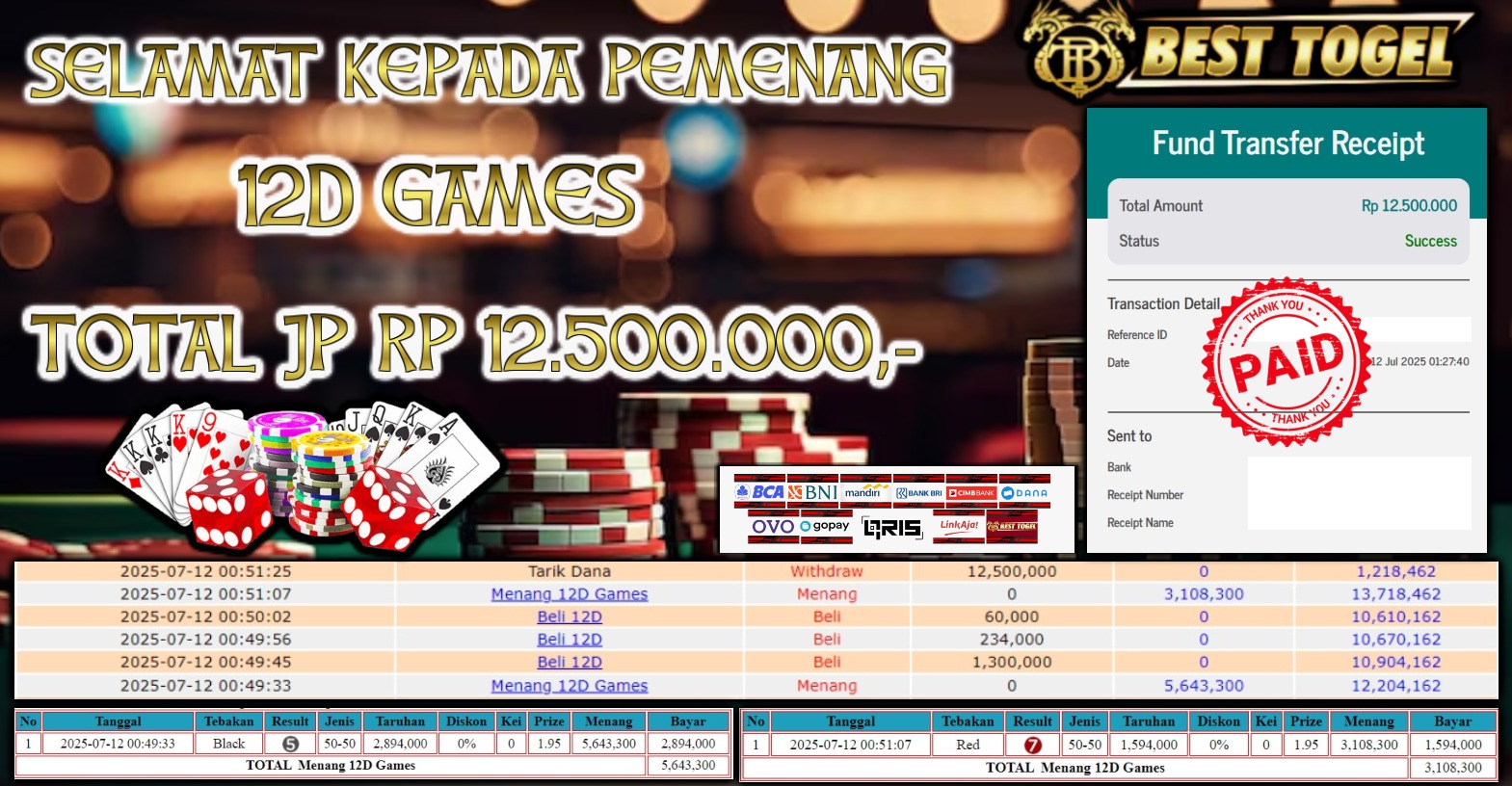 Selamat kepada User id : PRN***** Telah berhasil mendapatkan kemenangan besar pada permainan LIVE GAME 12D dengan total kemenangan Sebesar Rp 12.500.000,- Setelah mengisi formulir withdraw dengan kurung waktu hanya 5 – 10 menit pihak BESTTOGEL sudah melakukan transfer kepada pemilik Userid dan dana sudah dapat di cairkan oleh pemenang. Bukti pembayaran yang kami berikan merupakan bukti pembayaran yang SAH / VALID yang langung di dapatkan melaui tanda transfer transaksi dari Bank yang di tuju.