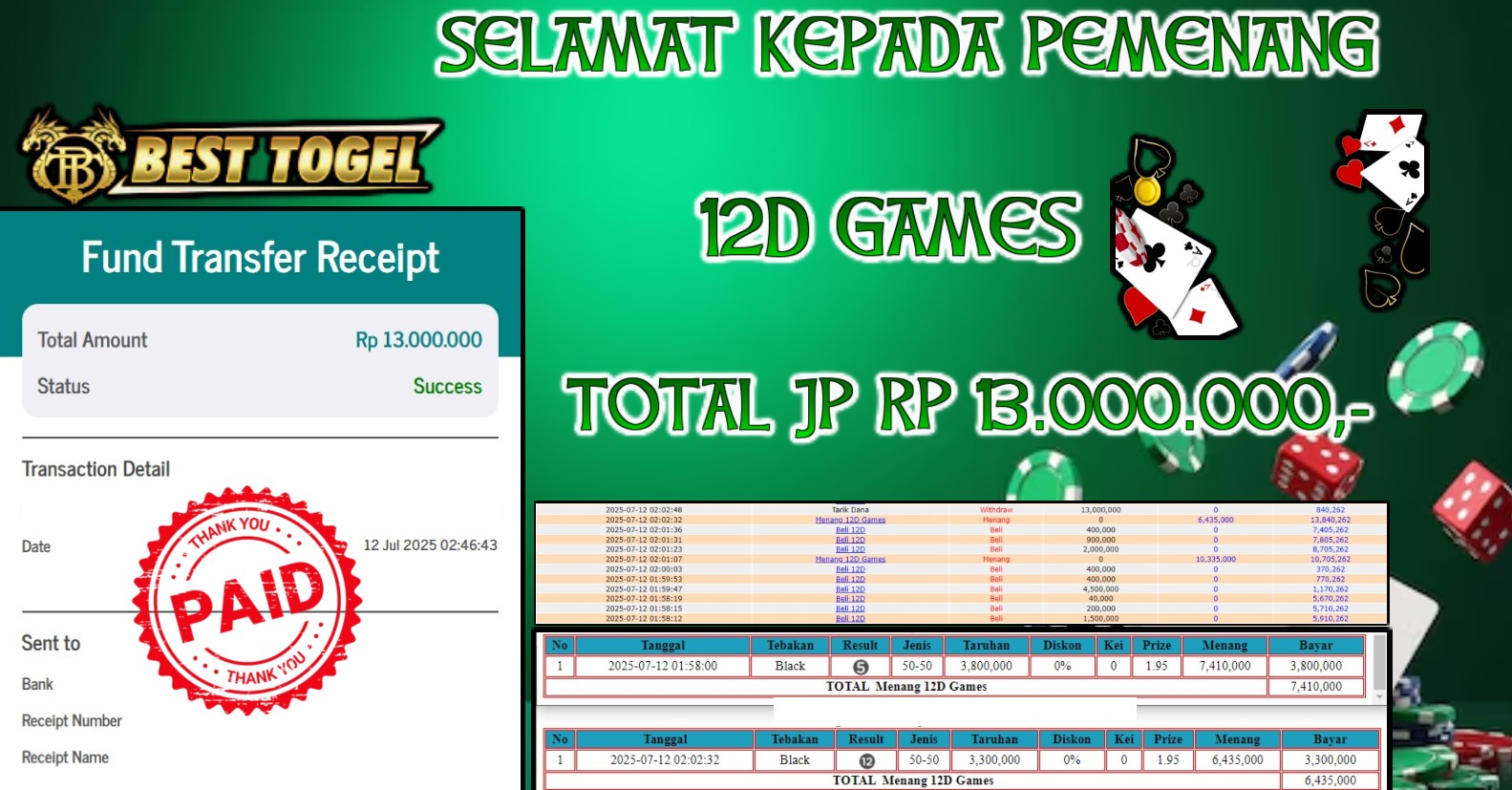 Selamat kepada User id : PRN***** Telah berhasil mendapatkan kemenangan besar pada permainan LIVE GAME 12D dengan total kemenangan Sebesar Rp.13.000.000,- Setelah mengisi formulir withdraw dengan kurung waktu hanya 5 – 10 menit pihak BESTTOGEL sudah melakukan transfer kepada pemilik Userid dan dana sudah dapat di cairkan oleh pemenang. Bukti pembayaran yang kami berikan merupakan bukti pembayaran yang SAH / VALID yang langung di dapatkan melaui tanda transfer transaksi dari Bank yang di tuju.