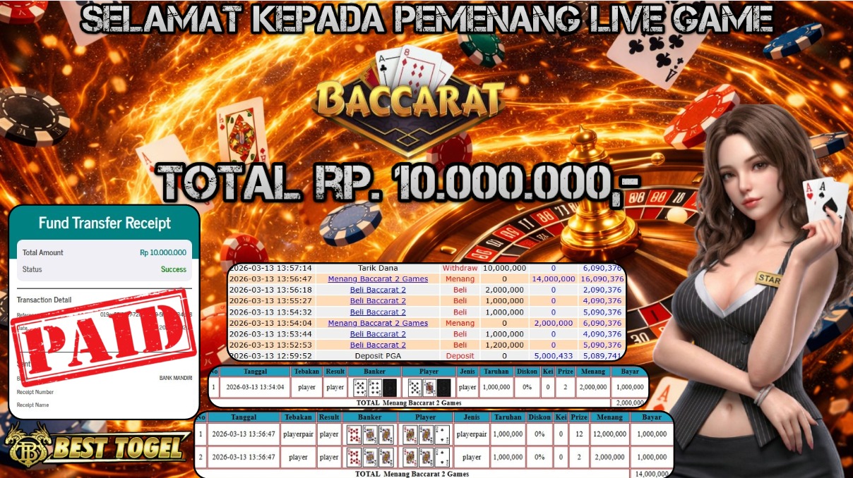 Selamat kepada User id : GFR****** Telah berhasil mendapatkan kemenangan besar pada permainan LIVE GAME BACCARAT 2 dengan total kemenangan Sebesar Rp. 10.000.000,– Setelah mengisi formulir withdraw dengan kurung waktu hanya 5 – 10 menit pihak BESTTOGEL sudah melakukan transfer kepada pemilik Userid dan dana sudah dapat di cairkan oleh pemenang. Bukti pembayaran yang kami berikan merupakan bukti pembayaran yang SAH / VALID yang langung di dapatkan melaui tanda transfer transaksi dari Bank yang di tuju.
