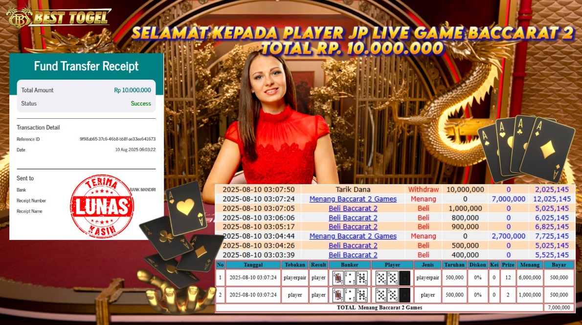 kepada User id : GFR***** Telah berhasil mendapatkan kemenangan besar pada permainan LIVE GAME BACCARAT 2 dengan total kemenangan Sebesar Rp. 10.000.000,00- Setelah mengisi formulir withdraw dengan kurung waktu hanya 5 – 10 menit pihak BESTTOGEL sudah melakukan transfer kepada pemilik Userid dan dana sudah dapat di cairkan oleh pemenang. Bukti pembayaran yang kami berikan merupakan bukti pembayaran yang SAH / VALID yang langung di dapatkan melaui tanda transfer transaksi dari Bank yang di tuju.