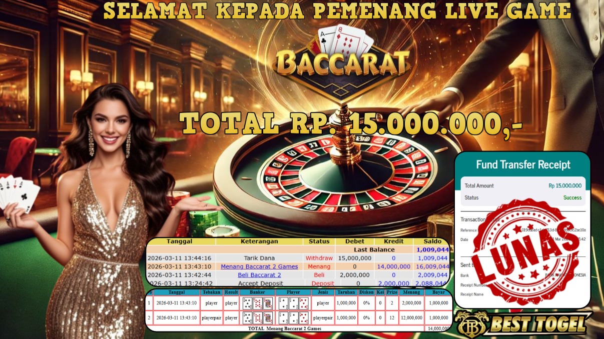 Selamat kepada User id : GFRN****** Telah berhasil mendapatkan kemenangan besar pada permainan LIVE GAME BACCARAT 2 dengan total kemenangan Sebesar Rp. 15.000.000,– Setelah mengisi formulir withdraw dengan kurung waktu hanya 5 – 10 menit pihak BESTTOGEL sudah melakukan transfer kepada pemilik Userid dan dana sudah dapat di cairkan oleh pemenang. Bukti pembayaran yang kami berikan merupakan bukti pembayaran yang SAH / VALID yang langung di dapatkan melaui tanda transfer transaksi dari Bank yang di tuju.
