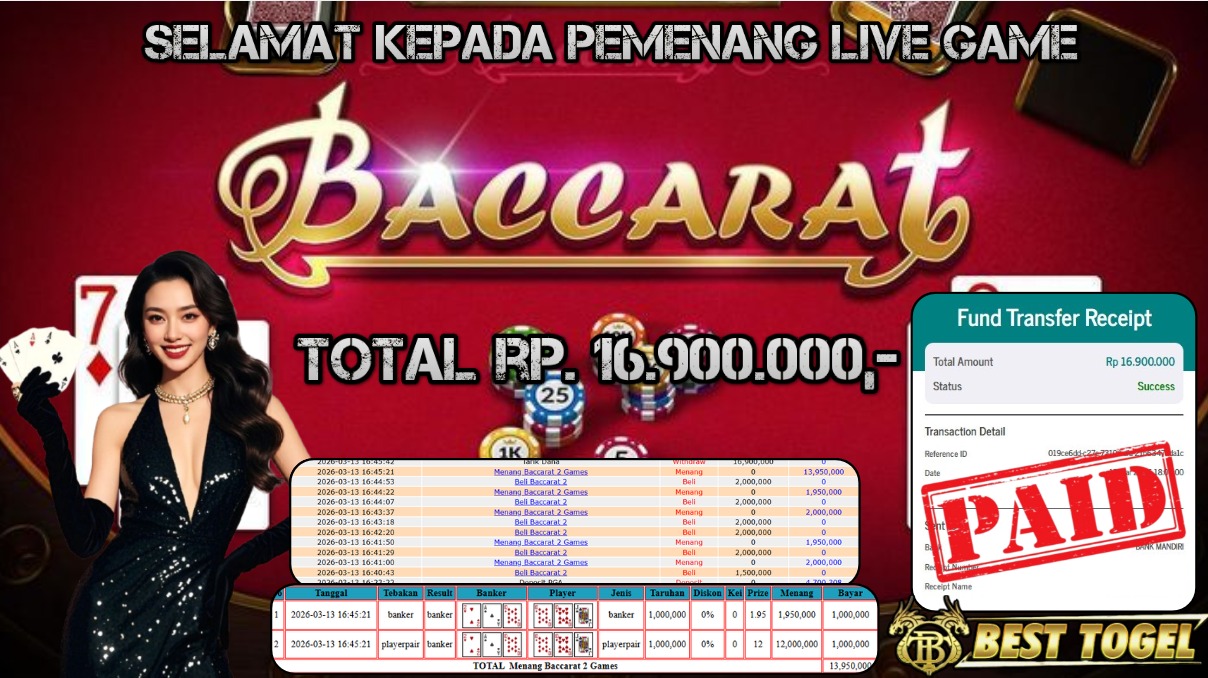 Selamat kepada User id : GFR****** Telah berhasil mendapatkan kemenangan besar pada permainan LIVE GAME BACCARAT 2 dengan total kemenangan Sebesar Rp. 16.900.000,– Setelah mengisi formulir withdraw dengan kurung waktu hanya 5 – 10 menit pihak BESTTOGEL sudah melakukan transfer kepada pemilik Userid dan dana sudah dapat di cairkan oleh pemenang. Bukti pembayaran yang kami berikan merupakan bukti pembayaran yang SAH / VALID yang langung di dapatkan melaui tanda transfer transaksi dari Bank yang di tuju.