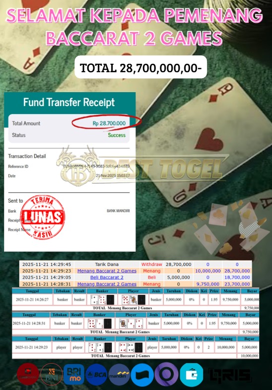 Selamat kepada User id : NER****** Telah berhasil mendapatkan kemenangan besar pada permainan LIVE GAME BACCARAT 2 dengan total kemenangan Sebesar Rp 28.700.000 ,- Setelah mengisi formulir withdraw dengan kurung waktu hanya 5 – 10 menit pihak BESTTOGEL sudah melakukan transfer kepada pemilik Userid dan dana sudah dapat di cairkan oleh pemenang. Bukti pembayaran yang kami berikan merupakan bukti pembayaran yang SAH / VALID yang langung di dapatkan melaui tanda transfer transaksi dari Bank yang di tuju.