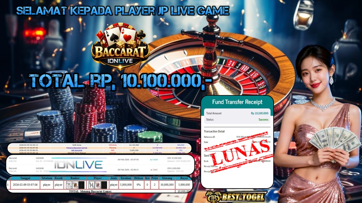 Selamat kepada User id : CIE****** Telah berhasil mendapatkan kemenangan besar pada permainan LIVE GAME BACCARAT dengan total kemenangan Sebesar Rp.10.100.000,– Setelah mengisi formulir withdraw dengan kurung waktu hanya 5 – 10 menit pihak BESTTOGEL sudah melakukan transfer kepada pemilik Userid dan dana sudah dapat di cairkan oleh pemenang. Bukti pembayaran yang kami berikan merupakan bukti pembayaran yang SAH / VALID yang langung di dapatkan melaui tanda transfer transaksi dari Bank yang di tuju.