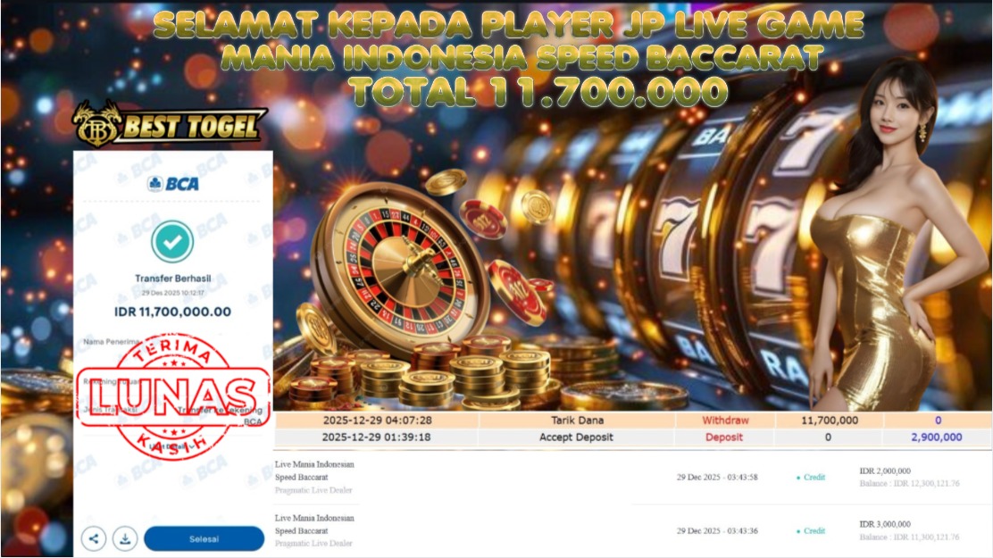 Selamat kepada User id : OAM****** Telah berhasil mendapatkan kemenangan besar pada permainan LIVE GAME MANIA INDONESIA SPEED BACCARAT dengan total kemenangan Sebesar Rp. 11.700.000,- Setelah mengisi formulir withdraw dengan kurung waktu hanya 5 – 10 menit pihak BESTTOGEL sudah melakukan transfer kepada pemilik Userid dan dana sudah dapat di cairkan oleh pemenang. Bukti pembayaran yang kami berikan merupakan bukti pembayaran yang SAH / VALID yang langung di dapatkan melaui tanda transfer transaksi dari Bank yang di tuju.