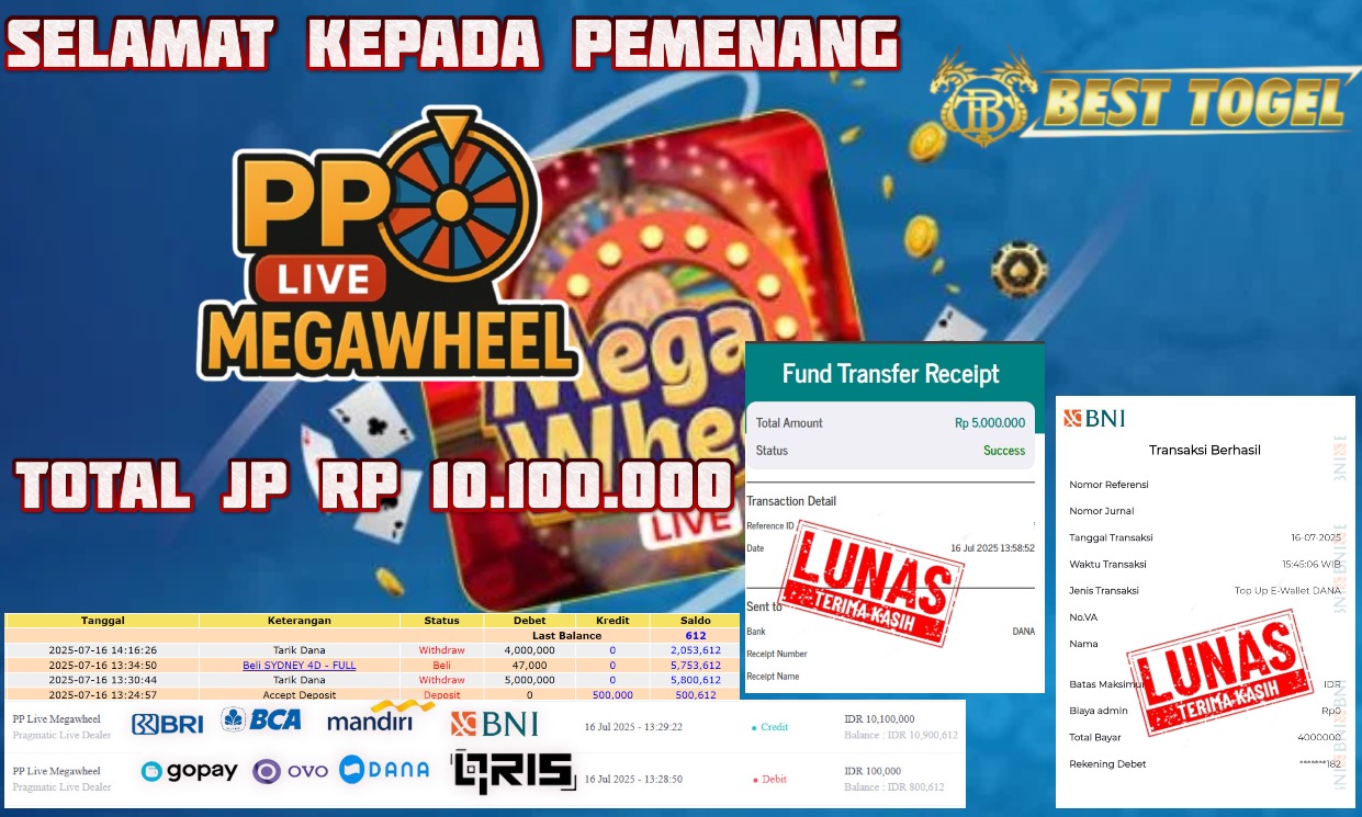 kepada User id : SEH***** Telah berhasil mendapatkan kemenangan besar pada permainan LIVE GAME PP LIVE MEGAWHEEL dengan total kemenangan Sebesar Rp. 10.100.000,00- Setelah mengisi formulir withdraw dengan kurung waktu hanya 5 – 10 menit pihak BESTTOGEL sudah melakukan transfer kepada pemilik Userid dan dana sudah dapat di cairkan oleh pemenang. Bukti pembayaran yang kami berikan merupakan bukti pembayaran yang SAH / VALID yang langung di dapatkan melaui tanda transfer transaksi dari Bank yang di tuju.