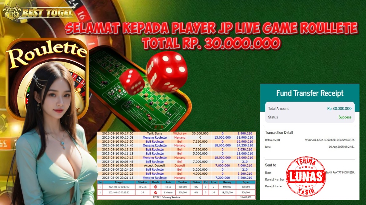 BUKTI JACKPOT LIVE GAME ROULETTE Rp. 30.000.000,00- LUNAS