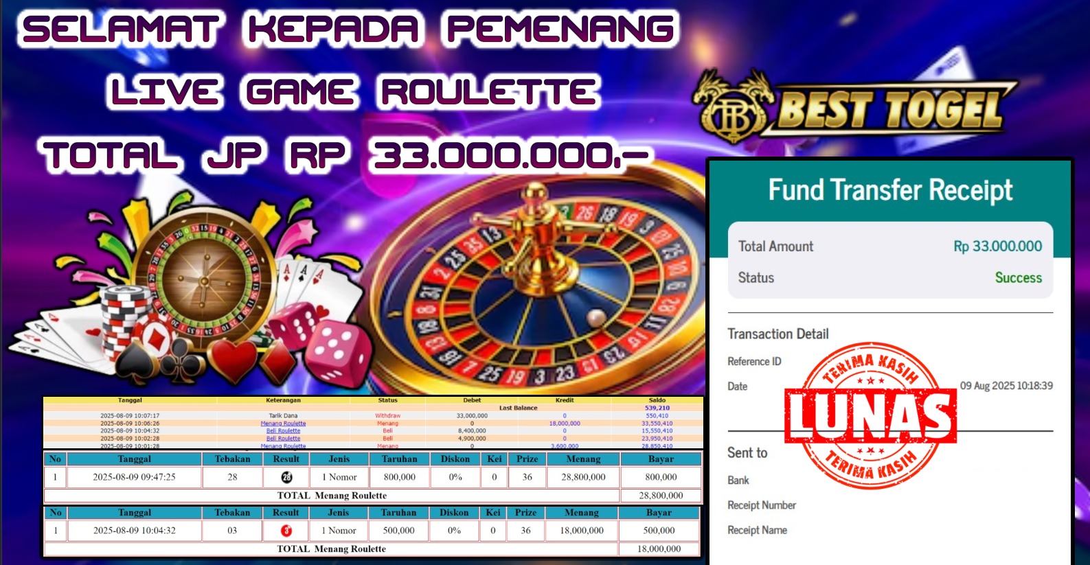 kepada User id : GDN***** Telah berhasil mendapatkan kemenangan besar pada permainan LIVE GAME ROULETTE dengan total kemenangan Sebesar Rp. 33.000.000,00- Setelah mengisi formulir withdraw dengan kurung waktu hanya 5 – 10 menit pihak BESTTOGEL sudah melakukan transfer kepada pemilik Userid dan dana sudah dapat di cairkan oleh pemenang. Bukti pembayaran yang kami berikan merupakan bukti pembayaran yang SAH / VALID yang langung di dapatkan melaui tanda transfer transaksi dari Bank yang di tuju.