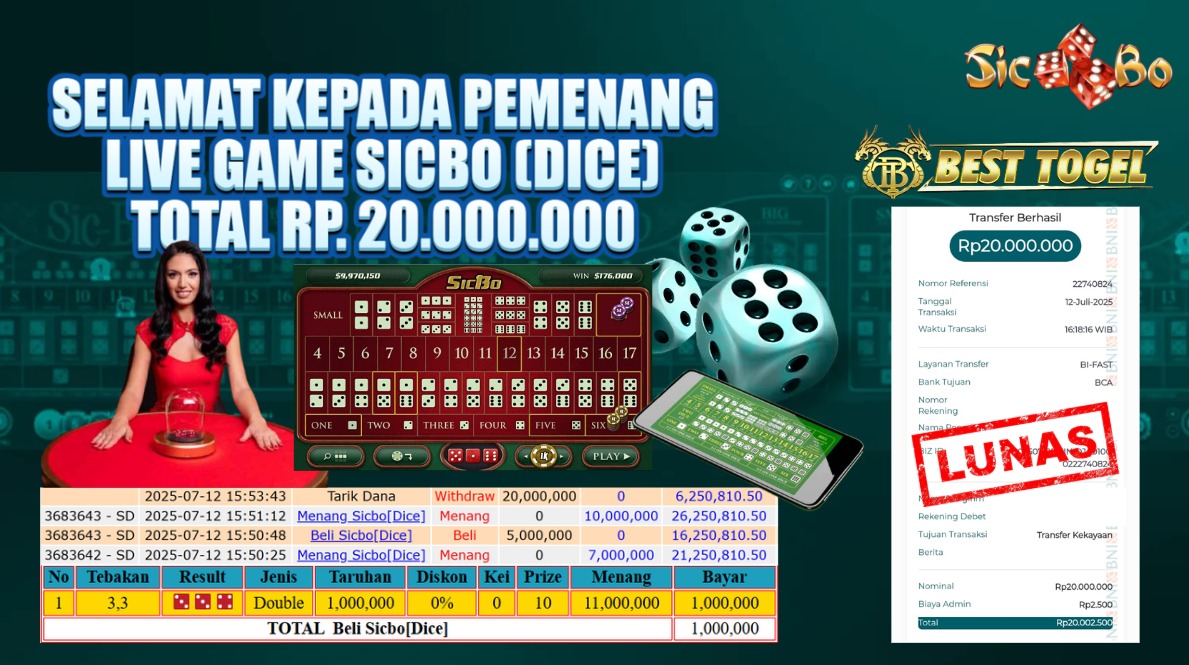 Selamat kepada User id : IN***** Telah berhasil mendapatkan kemenangan besar pada permainan LIVE GAME SICBO DICE dengan total kemenangan Sebesar Rp.20.000.000,- Setelah mengisi formulir withdraw dengan kurung waktu hanya 5 – 10 menit pihak BESTTOGEL sudah melakukan transfer kepada pemilik Userid dan dana sudah dapat di cairkan oleh pemenang. Bukti pembayaran yang kami berikan merupakan bukti pembayaran yang SAH / VALID yang langung di dapatkan melaui tanda transfer transaksi dari Bank yang di tuju.