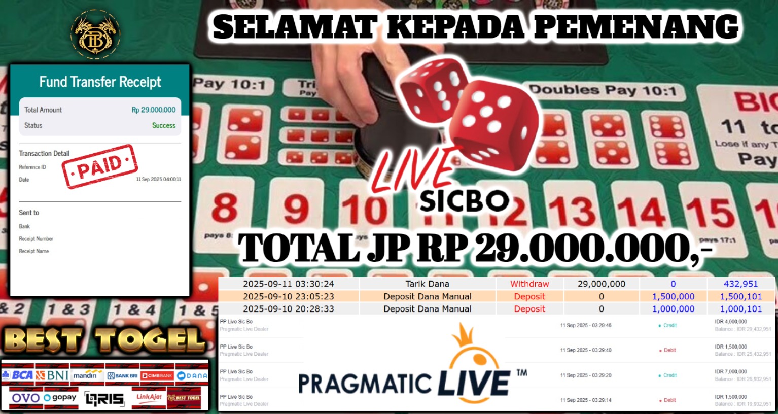 kepada User id : Yu**** Telah berhasil mendapatkan kemenangan besar pada permainan LIVE GAME SICBO dengan total kemenangan Sebesar Rp. 29.000.000,- Setelah mengisi formulir withdraw dengan kurung waktu hanya 5 – 10 menit pihak BESTTOGEL sudah melakukan transfer kepada pemilik Userid dan dana sudah dapat di cairkan oleh pemenang. Bukti pembayaran yang kami berikan merupakan bukti pembayaran yang SAH / VALID yang langung di dapatkan melaui tanda transfer transaksi dari Bank yang di tuju.