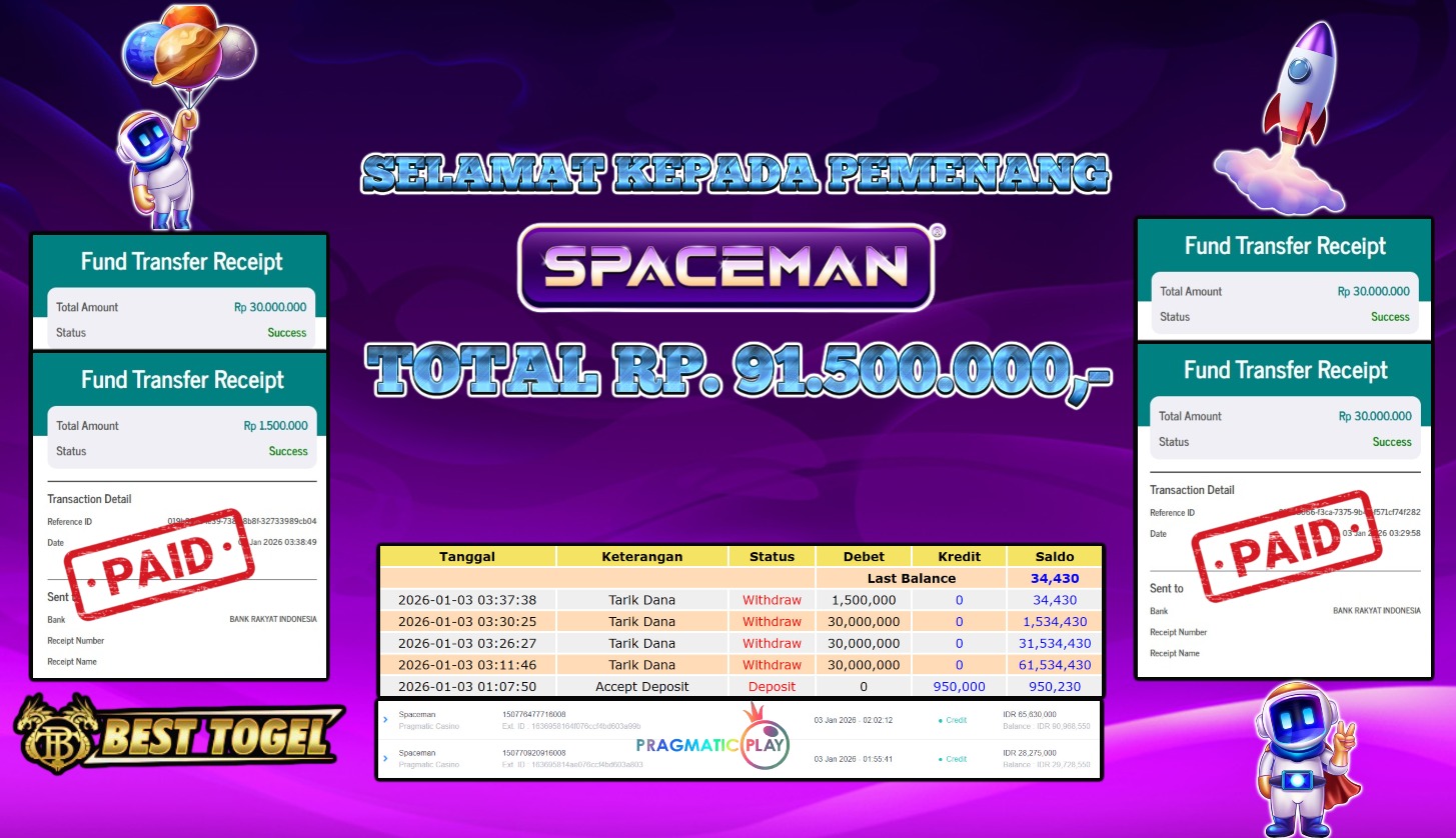 Selamat kepada User id : UAM****** Telah berhasil mendapatkan kemenangan besar pada permainan LIVE GAME SPACEMAN dengan total kemenangan Sebesar Rp.91.500.000,- Setelah mengisi formulir withdraw dengan kurung waktu hanya 5 – 10 menit pihak BESTTOGEL sudah melakukan transfer kepada pemilik Userid dan dana sudah dapat di cairkan oleh pemenang. Bukti pembayaran yang kami berikan merupakan bukti pembayaran yang SAH / VALID yang langung di dapatkan melaui tanda transfer transaksi dari Bank yang di tuju.