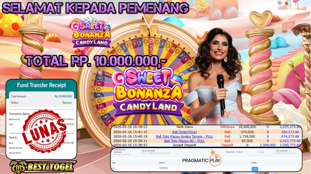 Selamat kepada User id : KPT****** Telah berhasil mendapatkan kemenangan besar pada permainan LIVE GAME SWEET BONANZA CANDYLAND dengan total kemenangan Sebesar Rp.10.000.000,– Setelah mengisi formulir withdraw dengan kurung waktu hanya 5 – 10 menit pihak BESTTOGEL sudah melakukan transfer kepada pemilik Userid dan dana sudah dapat di cairkan oleh pemenang. Bukti pembayaran yang kami berikan merupakan bukti pembayaran yang SAH / VALID yang langung di dapatkan melaui tanda transfer transaksi dari Bank yang di tuju.