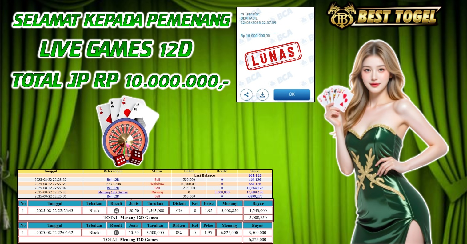 kepada User id : PRS***** Telah berhasil mendapatkan kemenangan besar pada permainan LIVE GAMES 12D dengan total kemenangan Sebesar Rp. 10.000.000,00- Setelah mengisi formulir withdraw dengan kurung waktu hanya 5 – 10 menit pihak BESTTOGEL sudah melakukan transfer kepada pemilik Userid dan dana sudah dapat di cairkan oleh pemenang. Bukti pembayaran yang kami berikan merupakan bukti pembayaran yang SAH / VALID yang langung di dapatkan melaui tanda transfer transaksi dari Bank yang di tuju.