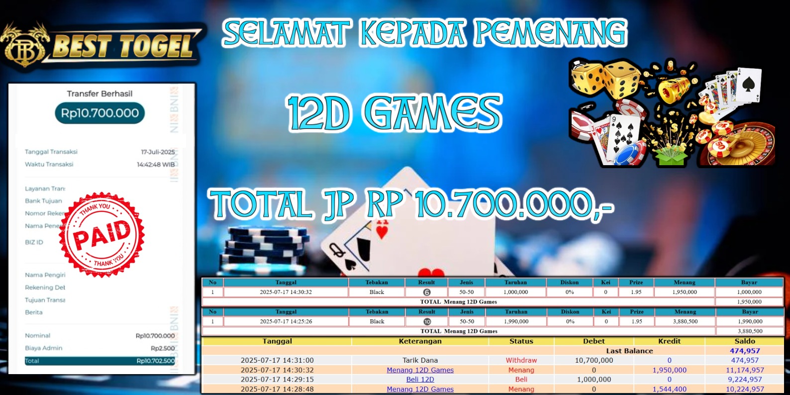 kepada User id : PRN***** Telah berhasil mendapatkan kemenangan besar pada permainan LIVE GAMES 12D dengan total kemenangan Sebesar Rp.10.700.000,00- Setelah mengisi formulir withdraw dengan kurung waktu hanya 5 – 10 menit pihak BESTTOGEL sudah melakukan transfer kepada pemilik Userid dan dana sudah dapat di cairkan oleh pemenang. Bukti pembayaran yang kami berikan merupakan bukti pembayaran yang SAH / VALID yang langung di dapatkan melaui tanda transfer transaksi dari Bank yang di tuju.