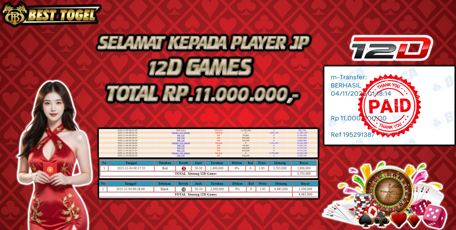 Selamat kepada User id : PRI****** Telah berhasil mendapatkan kemenangan besar pada permainan LIVE GAMES 12D dengan total kemenangan Sebesar Rp 11.000.000 ,- Setelah mengisi formulir withdraw dengan kurung waktu hanya 5 – 10 menit pihak BESTTOGEL sudah melakukan transfer kepada pemilik Userid dan dana sudah dapat di cairkan oleh pemenang. Bukti pembayaran yang kami berikan merupakan bukti pembayaran yang SAH / VALID yang langung di dapatkan melaui tanda transfer transaksi dari Bank yang di tuju.