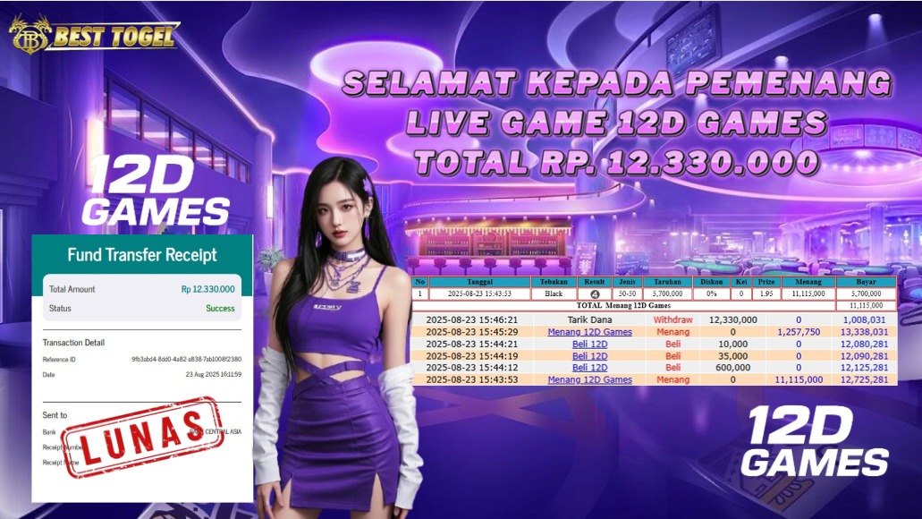 kepada User id : PRS***** Telah berhasil mendapatkan kemenangan besar pada permainan LIVE GAMES 12D dengan total kemenangan Sebesar Rp. 12.330.000,00- Setelah mengisi formulir withdraw dengan kurung waktu hanya 5 – 10 menit pihak BESTTOGEL sudah melakukan transfer kepada pemilik Userid dan dana sudah dapat di cairkan oleh pemenang. Bukti pembayaran yang kami berikan merupakan bukti pembayaran yang SAH / VALID yang langung di dapatkan melaui tanda transfer transaksi dari Bank yang di tuju.