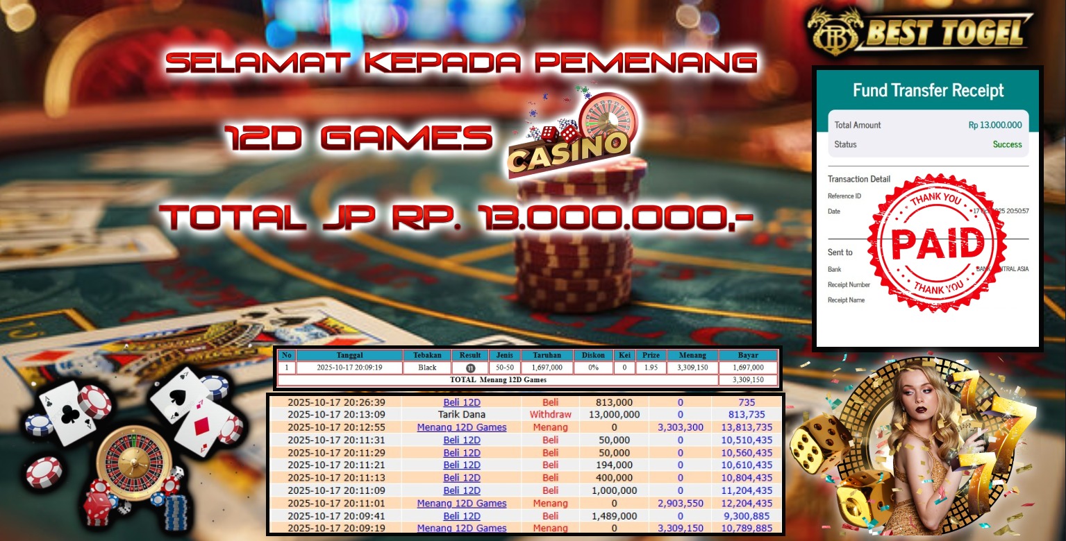 kepada User id : PST****** Telah berhasil mendapatkan kemenangan besar pada permainan LIVE GAMES 12D dengan total kemenangan Sebesar Rp. 13.000.000,-  Setelah mengisi formulir withdraw dengan kurung waktu hanya 5 – 10 menit pihak BESTTOGEL sudah melakukan transfer kepada pemilik Userid dan dana sudah dapat di cairkan oleh pemenang. Bukti pembayaran yang kami berikan merupakan bukti pembayaran yang SAH / VALID yang langung di dapatkan melaui tanda transfer transaksi dari Bank yang di tuju.
