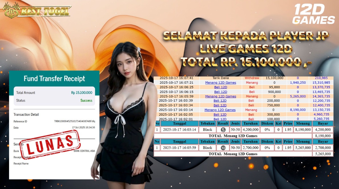 kepada User id : PST****** Telah berhasil mendapatkan kemenangan besar pada permainan LIVE GAMES 12D dengan total kemenangan Sebesar Rp. 15.100.000,- Setelah mengisi formulir withdraw dengan kurung waktu hanya 5 – 10 menit pihak BESTTOGEL sudah melakukan transfer kepada pemilik Userid dan dana sudah dapat di cairkan oleh pemenang. Bukti pembayaran yang kami berikan merupakan bukti pembayaran yang SAH / VALID yang langung di dapatkan melaui tanda transfer transaksi dari Bank yang di tuju.