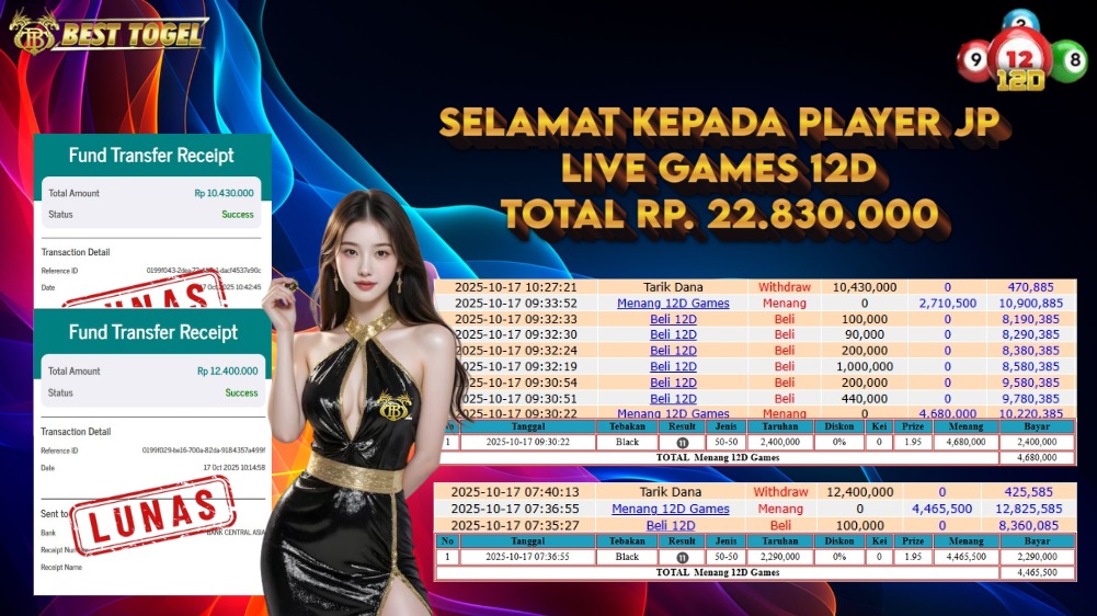 kepada User id : PST****** Telah berhasil mendapatkan kemenangan besar pada permainan LIVE GAMES 12D dengan total kemenangan Sebesar Rp. 22.830.000,- Setelah mengisi formulir withdraw dengan kurung waktu hanya 5 – 10 menit pihak BESTTOGEL sudah melakukan transfer kepada pemilik Userid dan dana sudah dapat di cairkan oleh pemenang. Bukti pembayaran yang kami berikan merupakan bukti pembayaran yang SAH / VALID yang langung di dapatkan melaui tanda transfer transaksi dari Bank yang di tuju.
