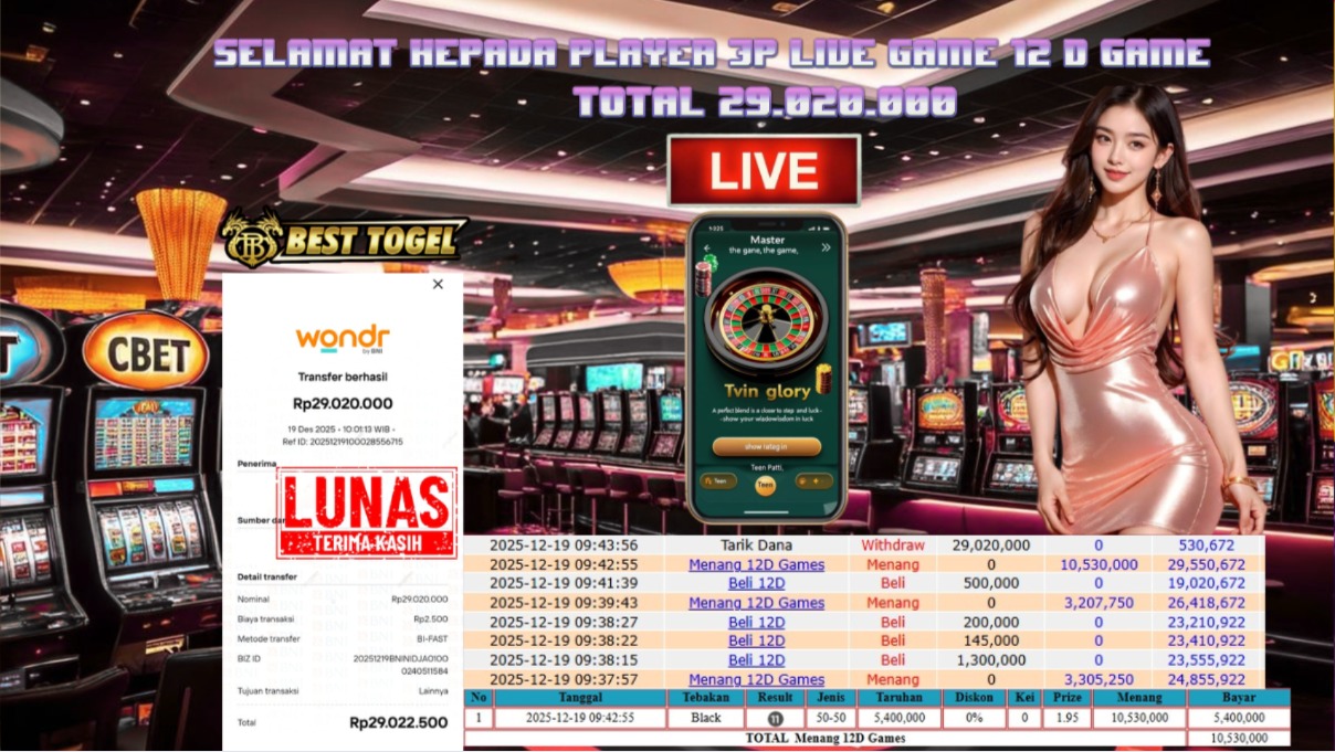 Selamat kepada User id : PCN****** Telah berhasil mendapatkan kemenangan besar pada permainan LIVE GAMES 12D dengan total kemenangan Sebesar Rp. 29.020.000 ,- Setelah mengisi formulir withdraw dengan kurung waktu hanya 5 – 10 menit pihak BESTTOGEL sudah melakukan transfer kepada pemilik Userid dan dana sudah dapat di cairkan oleh pemenang. Bukti pembayaran yang kami berikan merupakan bukti pembayaran yang SAH / VALID yang langung di dapatkan melaui tanda transfer transaksi dari Bank yang di tuju.