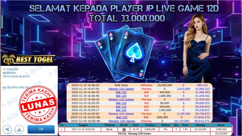 BUKTI JACKPOT LIVE GAMES 12D RP.33.000.000,- LUNAS