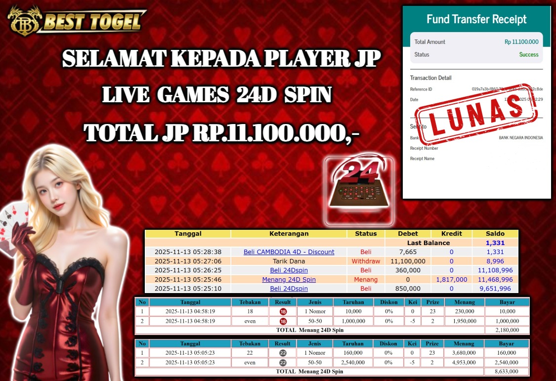 Selamat kepada User id : EVO****** Telah berhasil mendapatkan kemenangan besar pada permainan LIVE GAMES 24D SPIN dengan total kemenangan Sebesar Rp 11.100.000 ,- Setelah mengisi formulir withdraw dengan kurung waktu hanya 5 – 10 menit pihak BESTTOGEL sudah melakukan transfer kepada pemilik Userid dan dana sudah dapat di cairkan oleh pemenang. Bukti pembayaran yang kami berikan merupakan bukti pembayaran yang SAH / VALID yang langung di dapatkan melaui tanda transfer transaksi dari Bank yang di tuju.