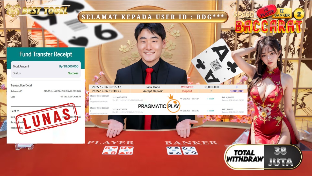 Selamat kepada User id : BDG****** Telah berhasil mendapatkan kemenangan besar pada permainan LIVE GAMES CHINESE SPEED BACCARAT 2 dengan total kemenangan Sebesar Rp. 38.000.000,- Setelah mengisi formulir withdraw dengan kurung waktu hanya 5 – 10 menit pihak  BESTTOGEL sudah melakukan transfer kepada pemilik Userid dan dana sudah dapat di cairkan oleh pemenang. Bukti pembayaran yang kami berikan merupakan bukti pembayaran yang SAH / VALID yang langung di dapatkan melaui tanda transfer transaksi dari Bank yang di tuju.