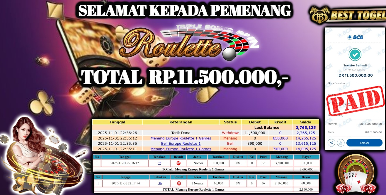 Selamat kepada User id : APE****** Telah berhasil mendapatkan kemenangan besar pada permainan LIVE GAMES ROULETTE dengan total kemenangan Sebesar Rp 11.500.000 ,- Setelah mengisi formulir withdraw dengan kurung waktu hanya 5 – 10 menit pihak BESTTOGEL sudah melakukan transfer kepada pemilik Userid dan dana sudah dapat di cairkan oleh pemenang. Bukti pembayaran yang kami berikan merupakan bukti pembayaran yang SAH / VALID yang langung di dapatkan melaui tanda transfer transaksi dari Bank yang di tuju.
