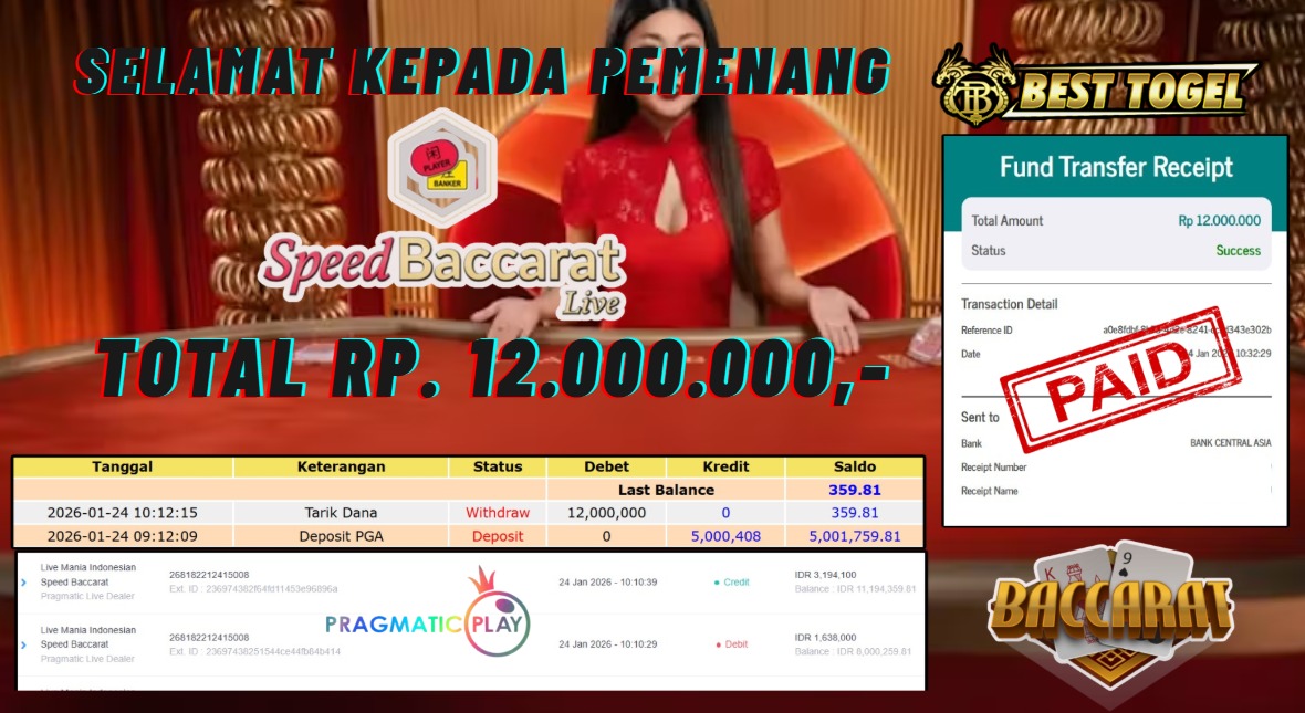 Selamat kepada User id : HOZ****** Telah berhasil mendapatkan kemenangan besar pada permainan LIVE GAMES SPEED BACCARAT  dengan total kemenangan Sebesar Rp.12.000.000,– Setelah mengisi formulir withdraw dengan kurung waktu hanya 5 – 10 menit pihak  BESTTOGEL sudah melakukan transfer kepada pemilik Userid dan dana sudah dapat di cairkan oleh pemenang. Bukti pembayaran yang kami berikan merupakan bukti pembayaran yang SAH / VALID yang langung di dapatkan melaui tanda transfer transaksi dari Bank yang di tuju.