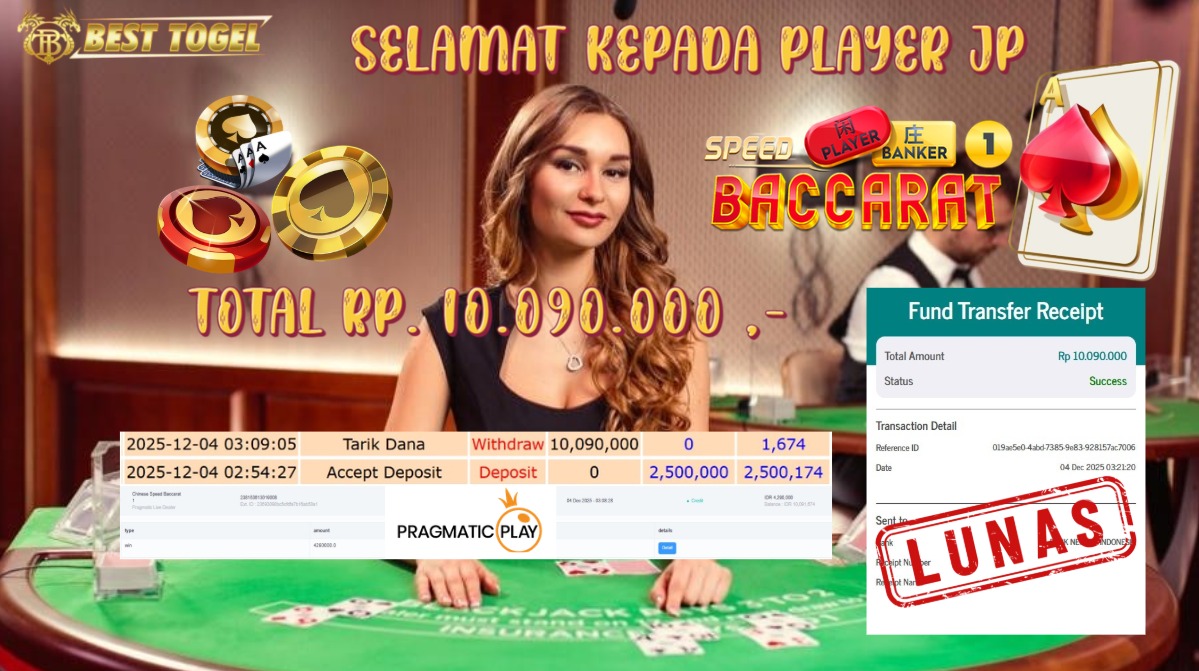 Selamat kepada User id : DQM****** Telah berhasil mendapatkan kemenangan besar pada permainan LIVE GAMES BACCARAT SPEED 1 dengan total kemenangan Sebesar Rp. 10.090.000 ,- Setelah mengisi formulir withdraw dengan kurung waktu hanya 5 – 10 menit pihak BESTTOGEL sudah melakukan transfer kepada pemilik Userid dan dana sudah dapat di cairkan oleh pemenang. Bukti pembayaran yang kami berikan merupakan bukti pembayaran yang SAH / VALID yang langung di dapatkan melaui tanda transfer transaksi dari Bank yang di tuju.