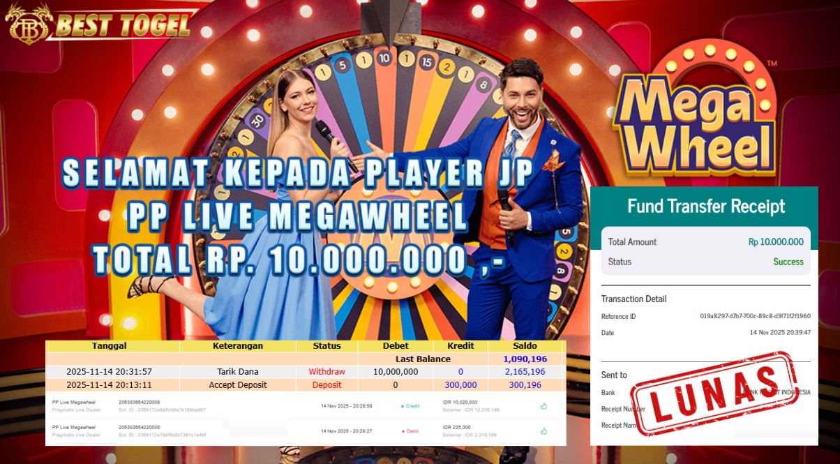 Selamat kepada User id : RNZ****** Telah berhasil mendapatkan kemenangan besar pada permainan PP LIVE MEGAWHEEL dengan total kemenangan Sebesar Rp 10.000.000 ,- Setelah mengisi formulir withdraw dengan kurung waktu hanya 5 – 10 menit pihak BESTTOGEL sudah melakukan transfer kepada pemilik Userid dan dana sudah dapat di cairkan oleh pemenang. Bukti pembayaran yang kami berikan merupakan bukti pembayaran yang SAH / VALID yang langung di dapatkan melaui tanda transfer transaksi dari Bank yang di tuju.