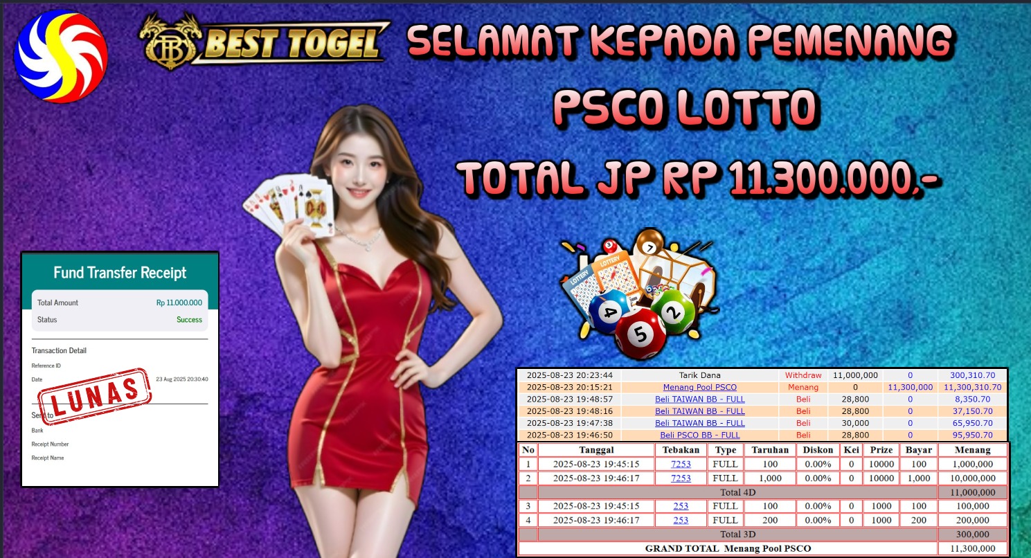 kepada User id : ASR***** Telah berhasil mendapatkan kemenangan besar pada permainan PSCO LOTTO dengan total kemenangan Sebesar Rp. 11.300.000,00- Setelah mengisi formulir withdraw dengan kurung waktu hanya 5 – 10 menit pihak BESTTOGEL sudah melakukan transfer kepada pemilik Userid dan dana sudah dapat di cairkan oleh pemenang. Bukti pembayaran yang kami berikan merupakan bukti pembayaran yang SAH / VALID yang langung di dapatkan melaui tanda transfer transaksi dari Bank yang di tuju.