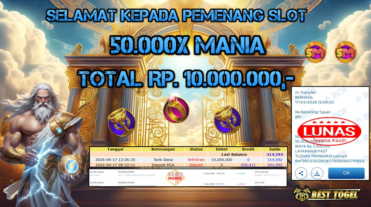 Selamat kepada User id : BQN*** Telah berhasil mendapatkan kemenangan besar pada permainanan slot 50.000X MANIA dengan total kemenangan Sebesar Rp. 10.000.000,- Setelah mengisi formulir withdraw dengan kurung waktu hanya 5 – 10 menit pihak  BESTTOGEL sudah melakukan transfer kepada pemilik Userid dan dana sudah dapat di cairkan oleh pemenang. Bukti pembayaran yang kami berikan merupakan bukti pembayaran yang SAH / VALID yang langung di dapatkan melaui tanda transfer transaksi dari Bank yang di tuju.Kami mengucapakan banyak Terima Kasih Kepada pemenang karena sudah mempercayakan kami sebagai Bandar Tepercaya yang membayar semua kemenangan member