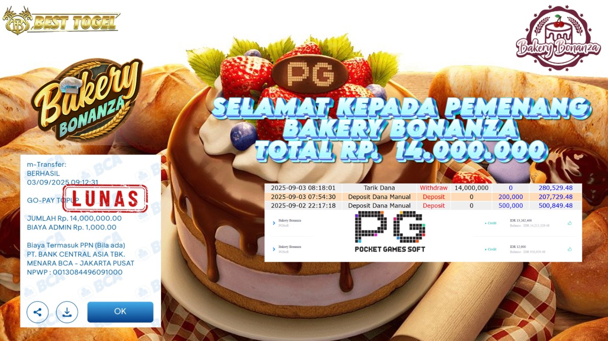 kepada User id : FBR***** Telah berhasil mendapatkan kemenangan besar pada permainan SLOT BAKERY BONAZA dengan total kemenangan Sebesar Rp. 14.000.000,00- Setelah mengisi formulir withdraw dengan kurung waktu hanya 5 – 10 menit pihak BESTTOGEL sudah melakukan transfer kepada pemilik Userid dan dana sudah dapat di cairkan oleh pemenang. Bukti pembayaran yang kami berikan merupakan bukti pembayaran yang SAH / VALID yang langung di dapatkan melaui tanda transfer transaksi dari Bank yang di tuju.