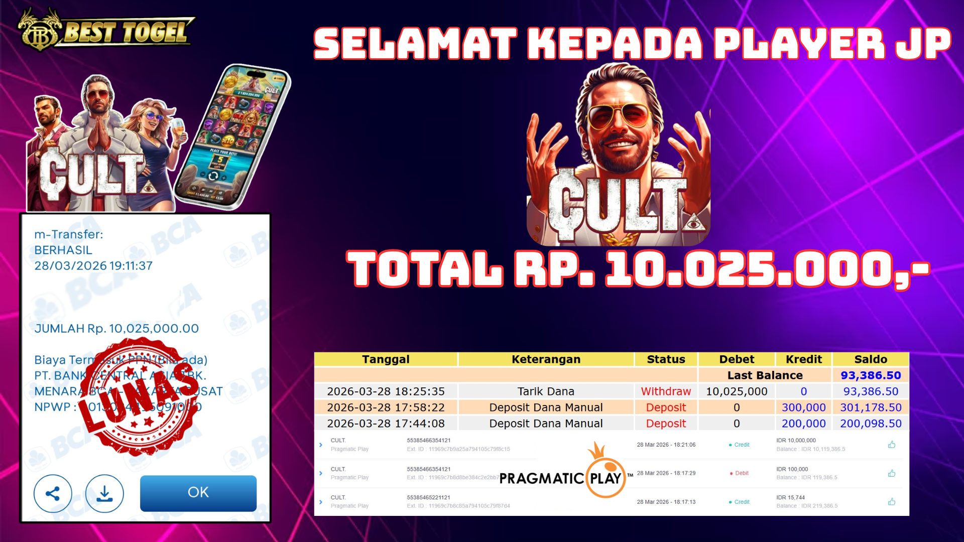 Selamat kepada User id : BLC****** Telah berhasil mendapatkan kemenangan besar pada permainan SLOT CULT dengan total kemenangan Sebesar Rp.10.025.000,– Setelah mengisi formulir withdraw dengan kurung waktu hanya 5 – 10 menit pihak BESTTOGEL sudah melakukan transfer kepada pemilik Userid dan dana sudah dapat di cairkan oleh pemenang. Bukti pembayaran yang kami berikan merupakan bukti pembayaran yang SAH / VALID yang langung di dapatkan melaui tanda transfer transaksi dari Bank yang di tuju.