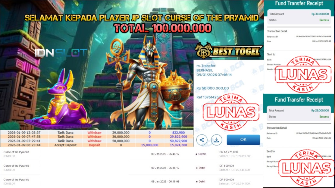 Selamat kepada User id : MHN****** Telah berhasil mendapatkan kemenangan besar pada permainan SLOT CURSE OF THE PRYAMID dengan total kemenangan Sebesar Rp.100.000.000,– Setelah mengisi formulir withdraw dengan kurung waktu hanya 5 – 10 menit pihak BESTTOGEL sudah melakukan transfer kepada pemilik Userid dan dana sudah dapat di cairkan oleh pemenang. Bukti pembayaran yang kami berikan merupakan bukti pembayaran yang SAH / VALID yang langung di dapatkan melaui tanda transfer transaksi dari Bank yang di tuju.