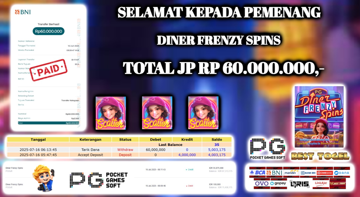 Selamat kepada User id : afk***** Telah berhasil mendapatkan kemenangan besar pada permainan SLOT DINER FRENZY SPINS dengan total kemenangan Sebesar Rp. 60.000.000,00- Setelah mengisi formulir withdraw dengan kurung waktu hanya 5 – 10 menit pihak BESTTOGEL sudah melakukan transfer kepada pemilik Userid dan dana sudah dapat di cairkan oleh pemenang. Bukti pembayaran yang kami berikan merupakan bukti pembayaran yang SAH / VALID yang langung di dapatkan melaui tanda transfer transaksi dari Bank yang di tuju.