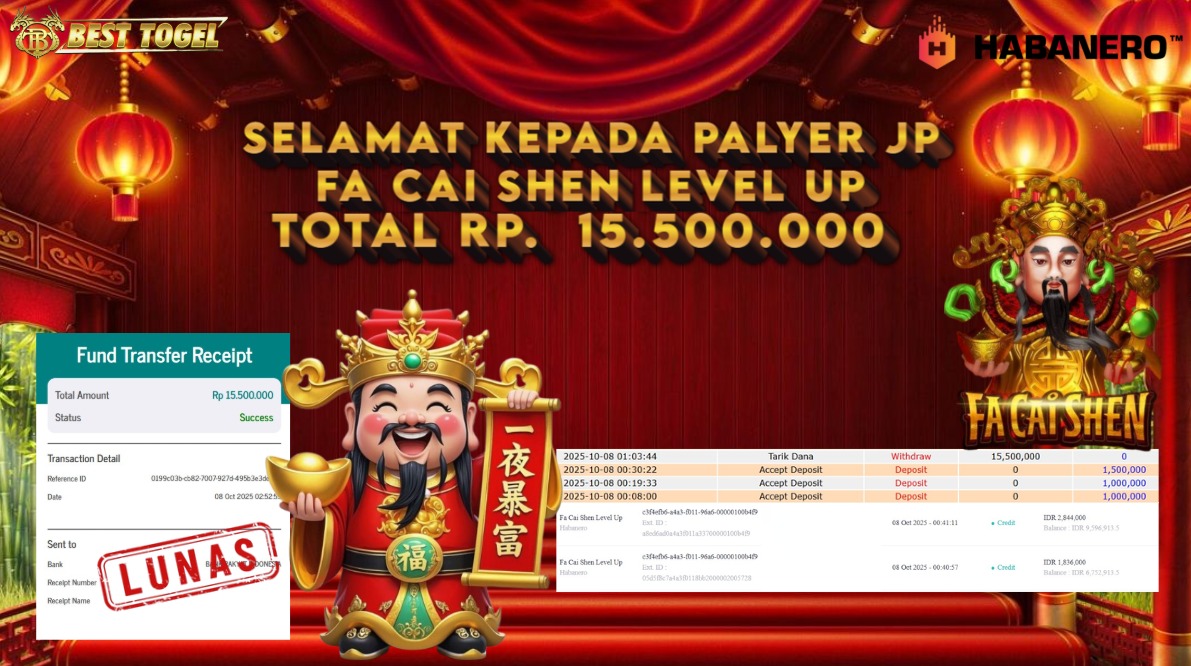 kepada User id : FAI****** Telah berhasil mendapatkan kemenangan besar pada permainan SLOT FA CAI SHEN LEVEL UP dengan total kemenangan Sebesar Rp.15.500.000,- Setelah mengisi formulir withdraw dengan kurung waktu hanya 5 – 10 menit pihak BESTTOGEL sudah melakukan transfer kepada pemilik Userid dan dana sudah dapat di cairkan oleh pemenang. Bukti pembayaran yang kami berikan merupakan bukti pembayaran yang SAH / VALID yang langung di dapatkan melaui tanda transfer transaksi dari Bank yang di tuju.