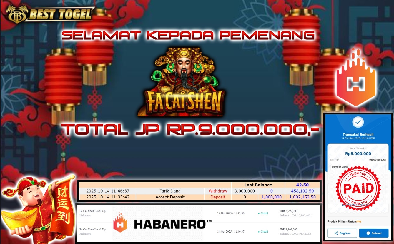 Kepada User id : DUG****** Telah berhasil mendapatkan kemenangan besar pada permainan SLOT FA CAI SHEN  dengan total kemenangan Sebesar Rp. 9.000.000,-  Setelah mengisi formulir withdraw dengan kurung waktu hanya 5 – 10 menit pihak BESTTOGEL sudah melakukan transfer kepada pemilik Userid dan dana sudah dapat di cairkan oleh pemenang. Bukti pembayaran yang kami berikan merupakan bukti pembayaran yang SAH / VALID yang langung di dapatkan melaui tanda transfer transaksi dari Bank yang di tuju.