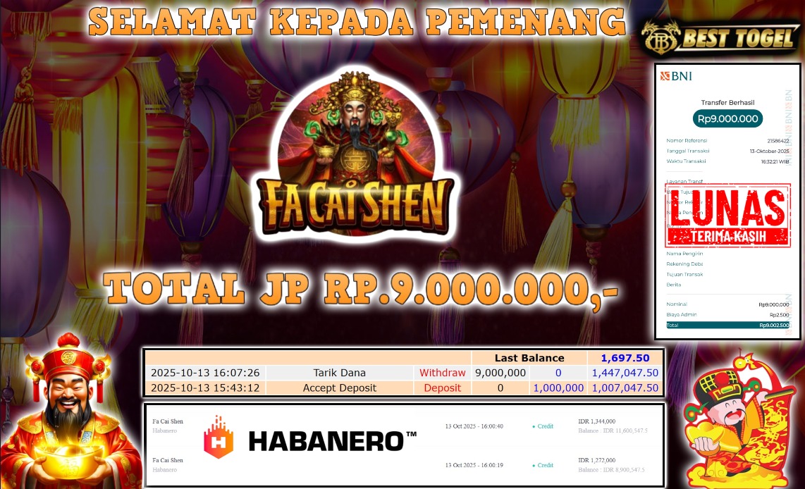 Kepada User id : JEMS****** Telah berhasil mendapatkan kemenangan besar pada permainan SLOT FA CAI SHEN dengan total kemenangan Sebesar Rp. 9.000.000,- Setelah mengisi formulir withdraw dengan kurung waktu hanya 5 – 10 menit pihak BESTTOGEL sudah melakukan transfer kepada pemilik Userid dan dana sudah dapat di cairkan oleh pemenang. Bukti pembayaran yang kami berikan merupakan bukti pembayaran yang SAH / VALID yang langung di dapatkan melaui tanda transfer transaksi dari Bank yang di tuju.