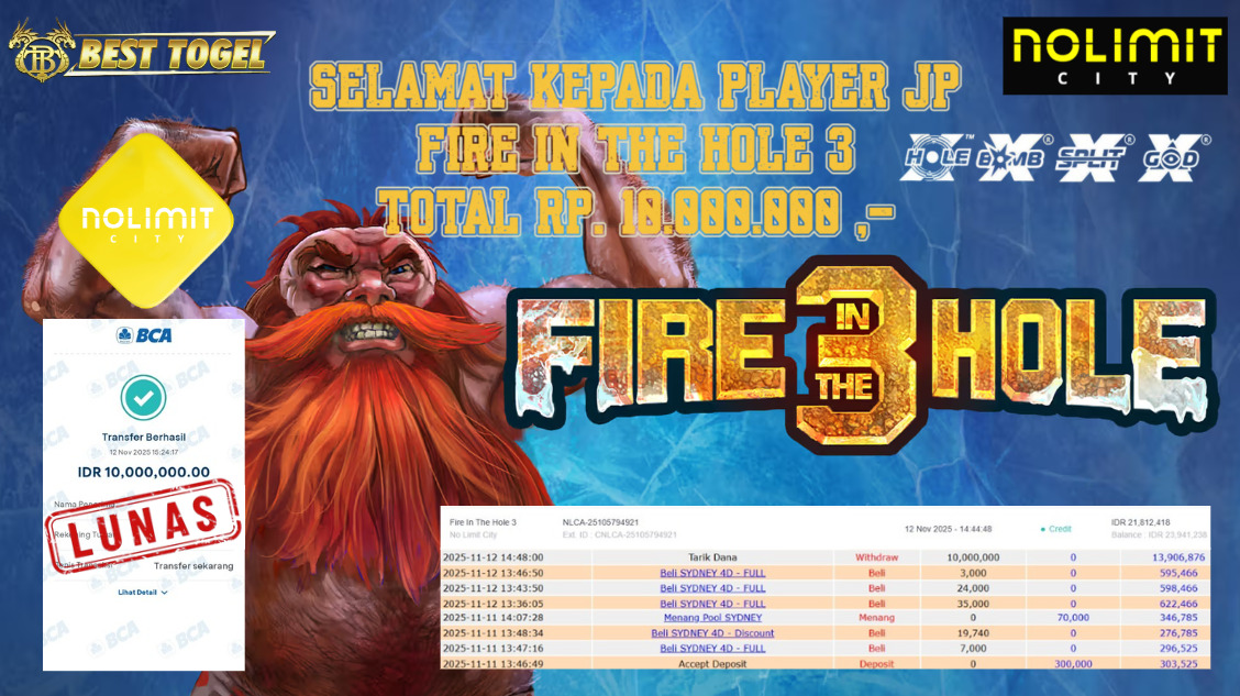 Selamat kepada User id : AC7****** Telah berhasil mendapatkan kemenangan besar pada permainan SLOT FIRE IN THE HOLE 3 dengan total kemenangan Sebesar Rp 10.000.000 ,- Setelah mengisi formulir withdraw dengan kurung waktu hanya 5 – 10 menit pihak BESTTOGEL sudah melakukan transfer kepada pemilik Userid dan dana sudah dapat di cairkan oleh pemenang. Bukti pembayaran yang kami berikan merupakan bukti pembayaran yang SAH / VALID yang langung di dapatkan melaui tanda transfer transaksi dari Bank yang di tuju.