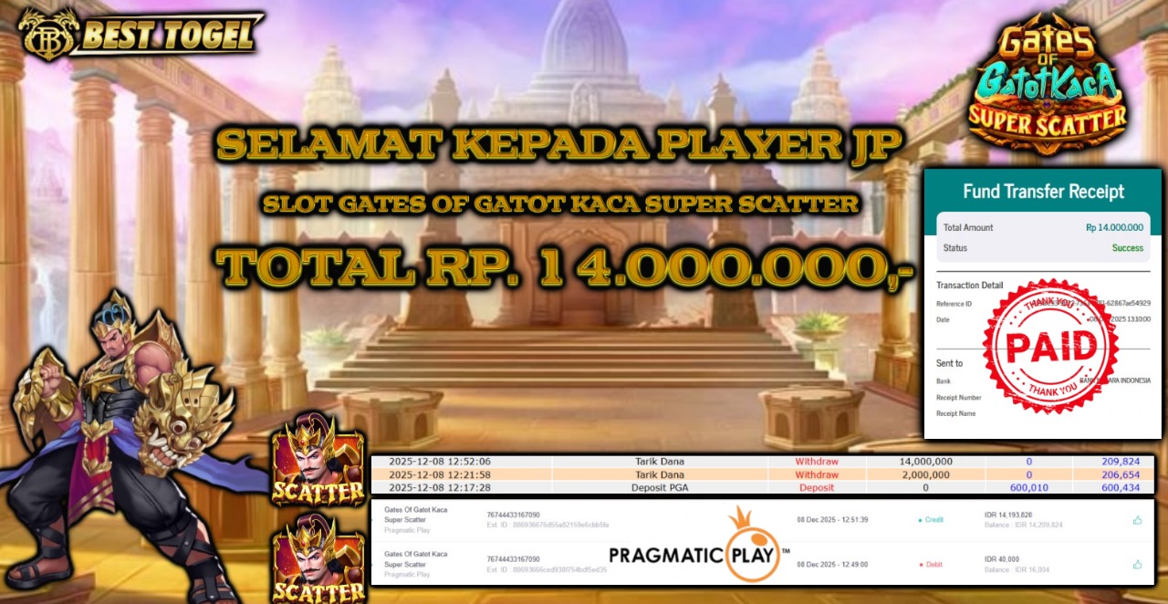 Selamat kepada User id : GTS****** Telah berhasil mendapatkan kemenangan besar pada permainan SLOT GATES GATOT KACA SUPER SCATTER   dengan total kemenangan Sebesar Rp. 14.000.000 ,- Setelah mengisi formulir withdraw dengan kurung waktu hanya 5 – 10 menit pihak  BESTTOGEL sudah melakukan transfer kepada pemilik Userid dan dana sudah dapat di cairkan oleh pemenang. Bukti pembayaran yang kami berikan merupakan bukti pembayaran yang SAH / VALID yang langung di dapatkan melaui tanda transfer transaksi dari Bank yang di tuju.