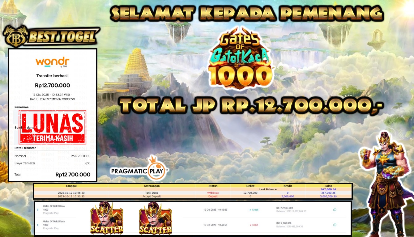 Kepada User id : RIN****** Telah berhasil mendapatkan kemenangan besar pada permainan SLOT GATES OF GATOT KACA 1000 dengan total kemenangan Sebesar Rp. 12.700.000,- Setelah mengisi formulir withdraw dengan kurung waktu hanya 5 – 10 menit pihak BESTTOGEL sudah melakukan transfer kepada pemilik Userid dan dana sudah dapat di cairkan oleh pemenang. Bukti pembayaran yang kami berikan merupakan bukti pembayaran yang SAH / VALID yang langung di dapatkan melaui tanda transfer transaksi dari Bank yang di tuju.