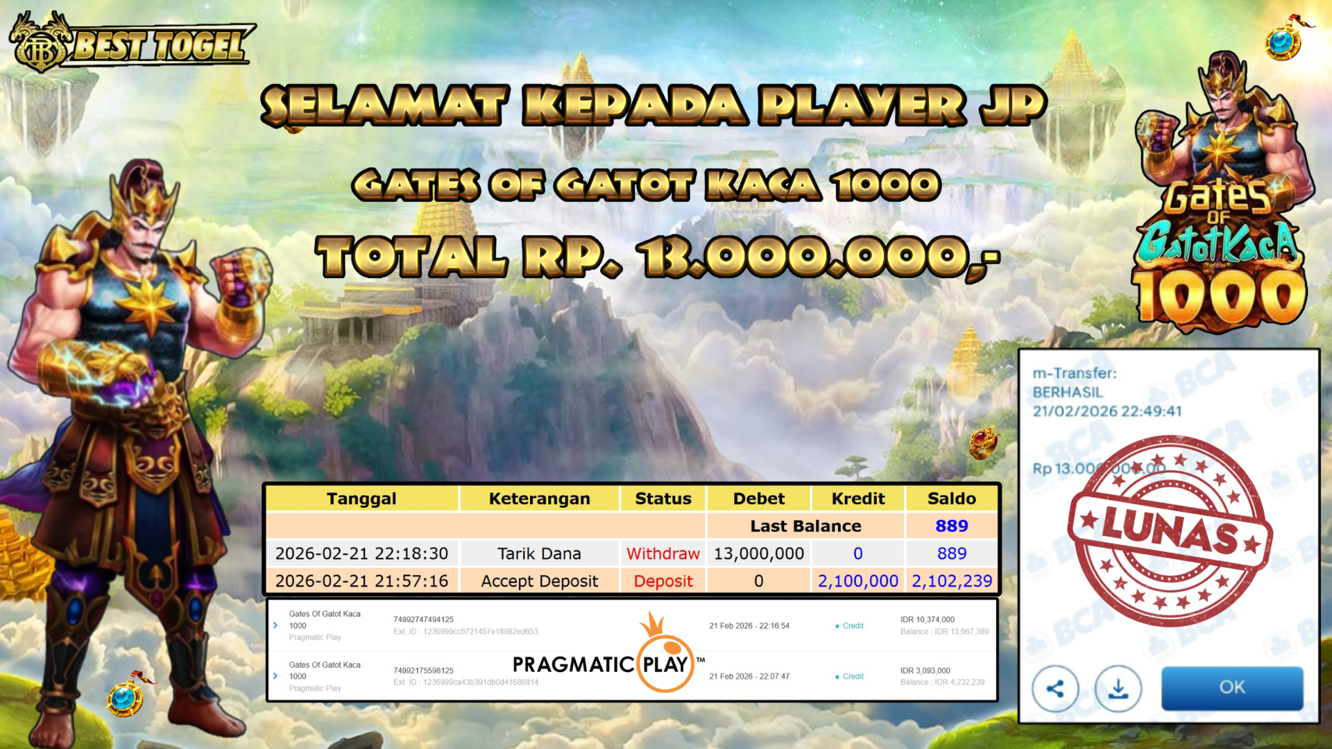 Selamat kepada User id : INS ****** Telah berhasil mendapatkan kemenangan besar pada permainan SLOT GATES OF GATOT KACA 1000 dengan total kemenangan Sebesar Rp.13.000.000,– Setelah mengisi formulir withdraw dengan kurung waktu hanya 5 – 10 menit pihak BESTTOGEL sudah melakukan transfer kepada pemilik Userid dan dana sudah dapat di cairkan oleh pemenang. Bukti pembayaran yang kami berikan merupakan bukti pembayaran yang SAH / VALID yang langung di dapatkan melaui tanda transfer transaksi dari Bank yang di tuju.